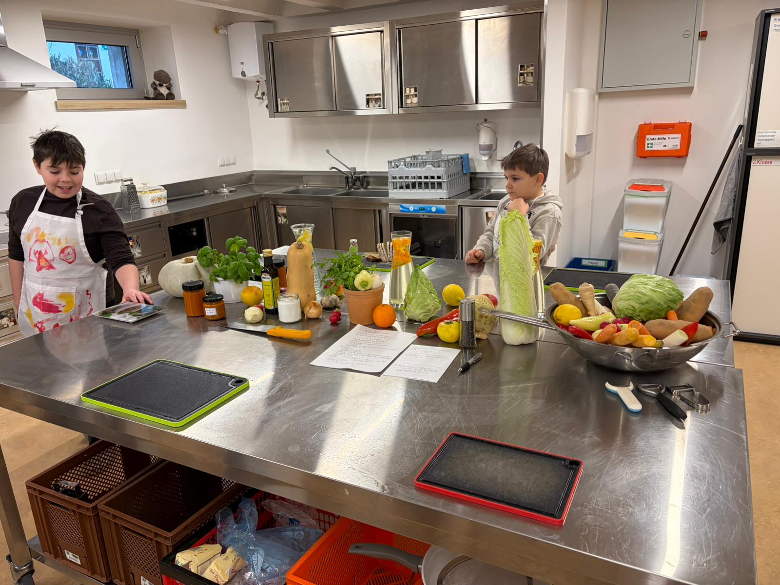 Den Anfang machten die 1. Klasse und die 3. Klasse (Otterklasse). Mit großer Begeisterung wurden Erdäpfel, Kürbis und weitere geerntete Produkte vorbereitet. Es wurde geschält, geschnitten, gerührt und natürlich auch probiert. In kleinen Gruppen arbeiteten die Kinder an verschiedenen Stationen und unterstützten sich gegenseitig. Mit viel Freude entstand Schritt für Schritt ein köstliches 3-gängiges Menü, das anschließend gemeinsam genossen wurde.